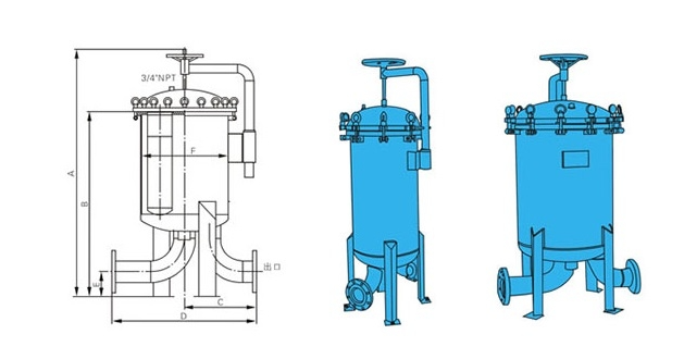 頂入式袋式過濾器由濾器、支撐網籃、濾袋、頂蓋、進出水口、搖臂、吊環、支腳等部件組成。頂入袋式過濾器工作時液體從過濾容器側面或者下面進液口進入,由被網籃支撐的濾袋上方沖入濾袋中,濾袋因液體的沖擊和均勻的壓力面展開,使得液體物料在整個過濾袋內表面得到均勻分布,透過濾袋的液體沿著金屬支承網籃壁,最后由過濾器底部出液口排出。水中的顆粒、懸浮物等被截留在濾袋內,完成過濾過程。